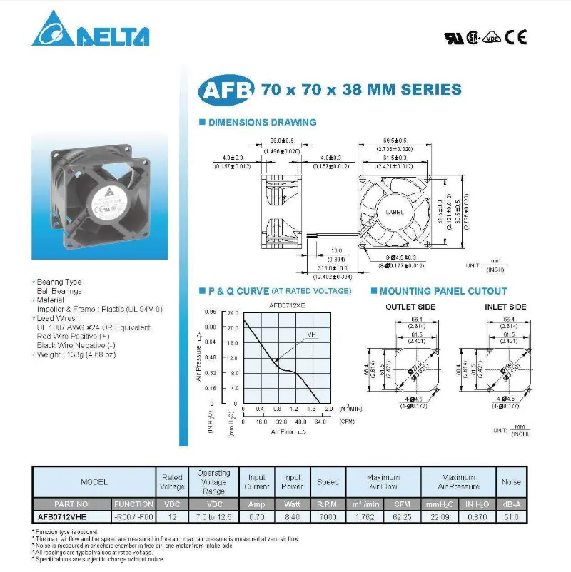 圖片僅供參考Original electric axial flow cooling fan AFB0712VHE 12V 0.7A 7038 DC fan