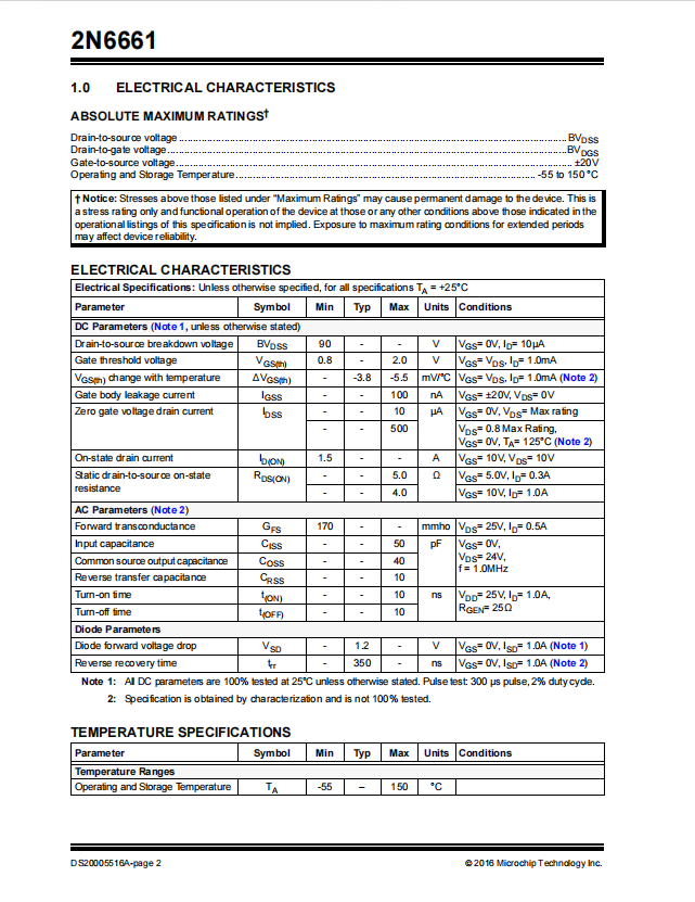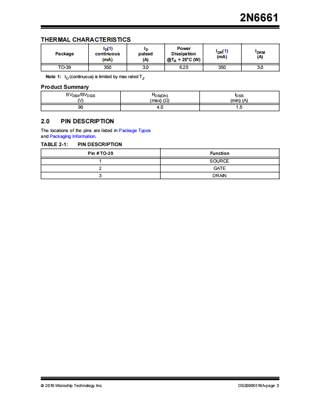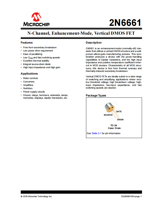 2N6661 is an enhancement-mode (normally-off) tran-sistor that utilizes a vertical DMOS structure and a well-proven silicon-gate manufacturing process. This com-bination produces a device with the power-handlingcapabilities of bipolar transistors, and the high inputimpedance and positive temperature coefficient inher-ent in MOS devices. Characteristic of all MOS structures, this device is free from thermal runaway andthermally-induced secondary breakdown.