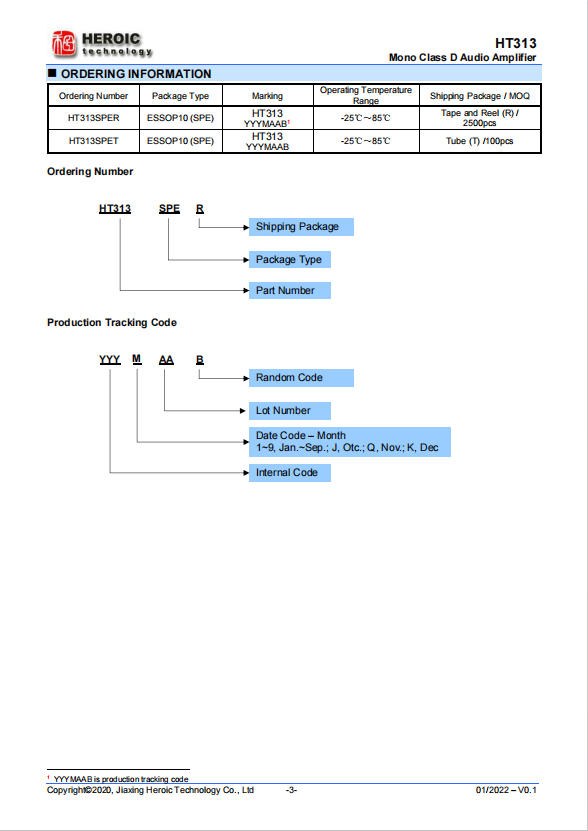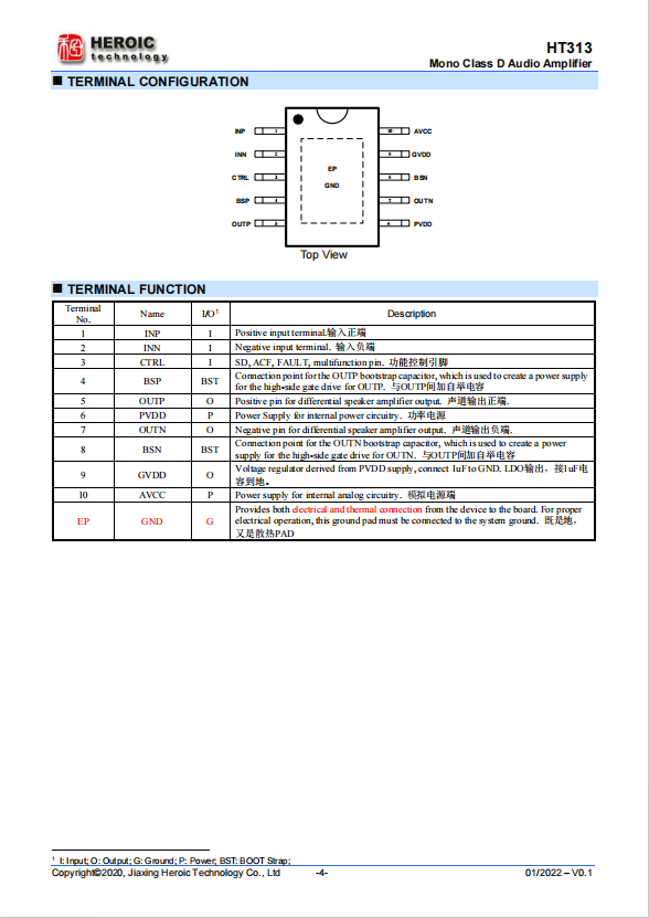 HT313 is a mono efficient, Class-D audio amplifier for driving speakers up to 23W/2 ?, THD+N=1% at PVDD = 12V.