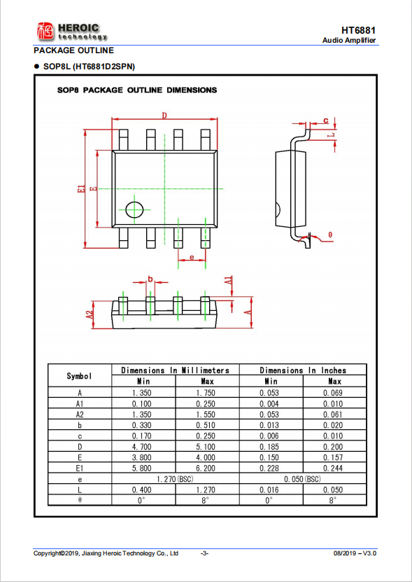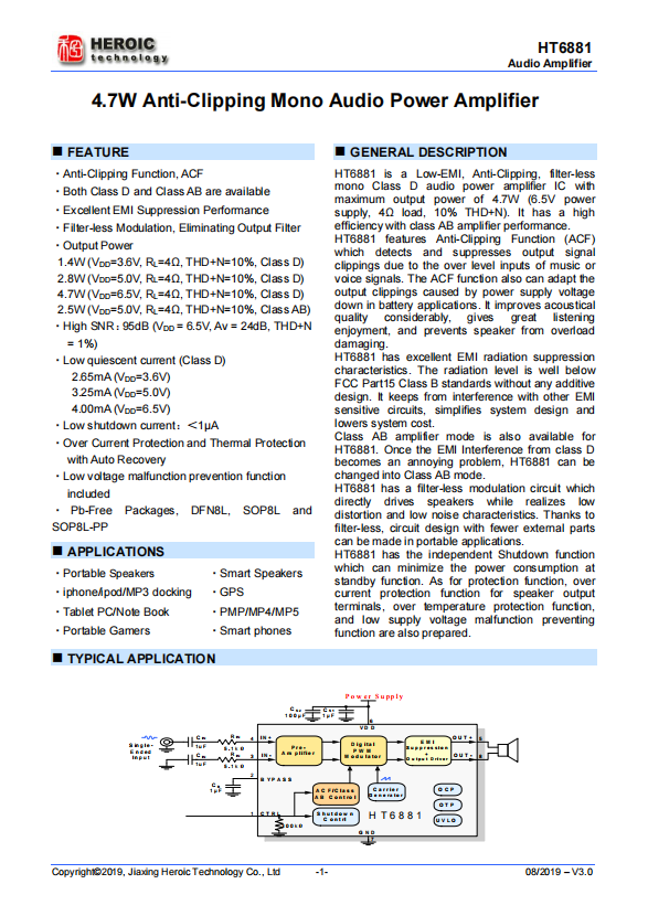 HT6881 is a Low-EMI, Anti-Clipping, filter-less mono Class D audio power amplifier IC with maximum output power of 4.7W (6.5V power supply, 4Ω load, 10 percent THD+N). It has a high efficiency with class AB amplifier performance.