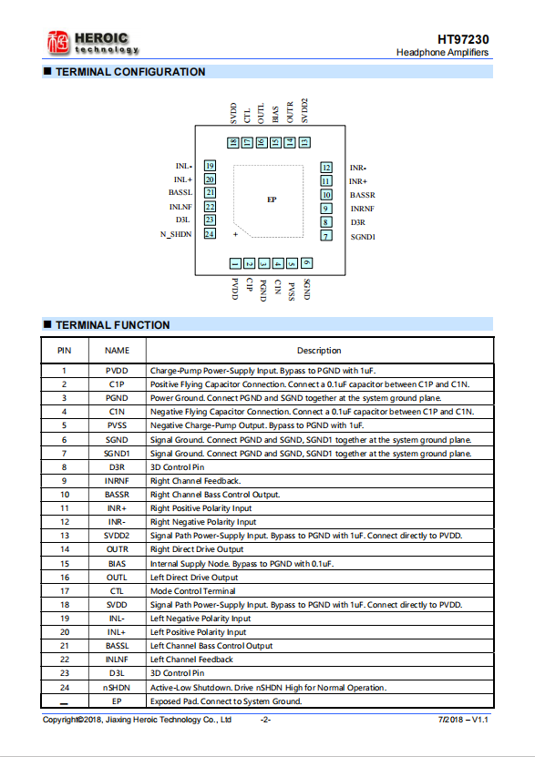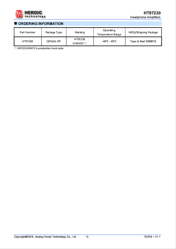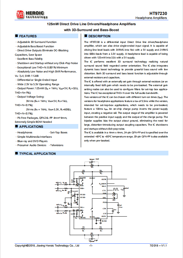 HT97230 has a 3D surround mode, which can create the feeling of 3D surround sound on stereo headphones. The HT97220 also has a bass enhancement mode, which can enhance the bass of a certain frequency band to varying degrees based on the frequency response characteristics of the headphones, achieving the effect of bass enhancement. HT97230 provides lead-free and halogen-free QFN24L-PP packaging, and offers customized requirements for QFN20L-PP packaging.