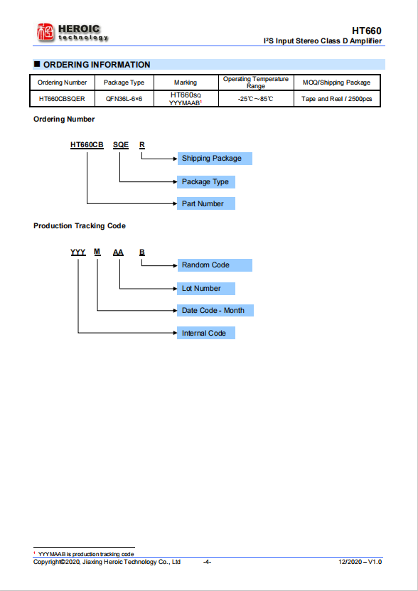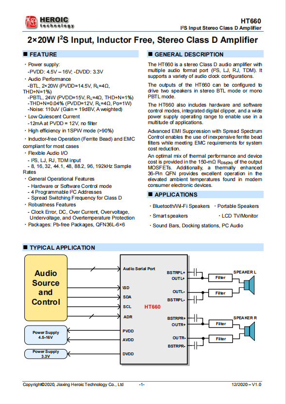 The HT660 is a stereo Class D audio amplifier with multiple audio format port (I2S, LJ, RJ, TDM). It supports a variety of audio clock configurations.