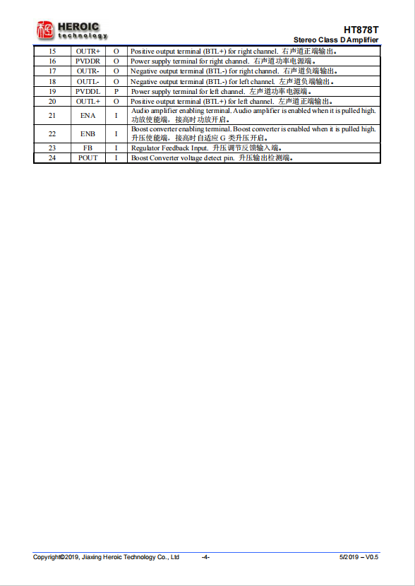 The HT878T is a stereo Class D audio amplifier that drives up to continuous 2×6.8W (1 percent THD+N, boosted to 8.3V) into 4ohm speaker. It also integrates Class AB amplifier to avoid EMI.
