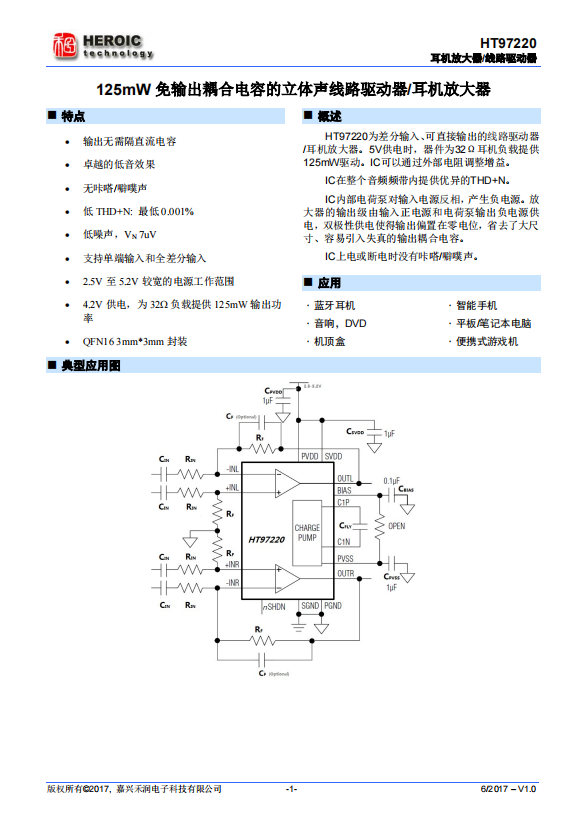 HT97220 is a differential input, direct output line driver/headphone amplifier. When powered by 5V, the device provides a 125mW driver for a 32 Ω headphone load. The IC can adjust its gain through external resistors.