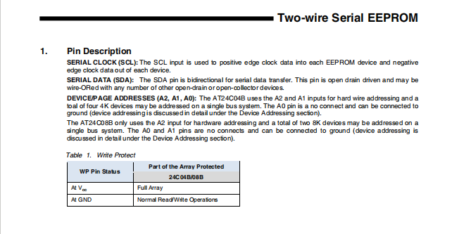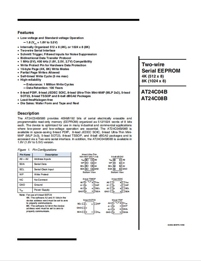 The AT24C04B/08B provides 4096/8192 bits of serial electrically erasable and programmable read-only memory (EEPROM) organized as 512/1024 words of 8 bits each. The device is optimized for use in many industrial and commercial applications where low-power and low-voltage operation are essential. The AT24C04B/08B is available in space-saving 8-lead PDIP, 8-lead JEDEC SOIC, 8-lead Ultra-Thin Mini-MAP (MLP 2x3), 5-lead SOT23, 8-lead TSSOP, and 8-ball dBGA2 packages and is accessed via a Two-wire serial interface. In addition, the AT24C04B/08B is available in 1.8V (1.8V to 5.5V) version.