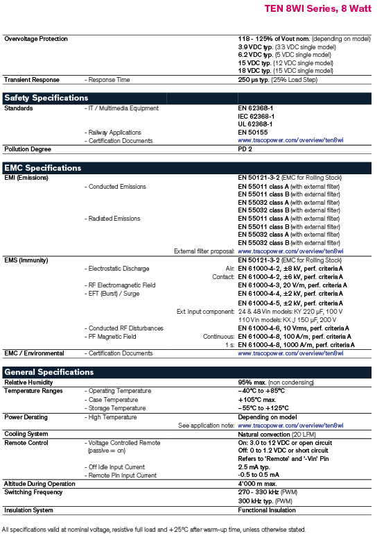 The TEN 8WI series is a family of high performance 8 Watt dc/dc converter modules featuring ultra wide 4:1 input voltage ranges in a DIP-24