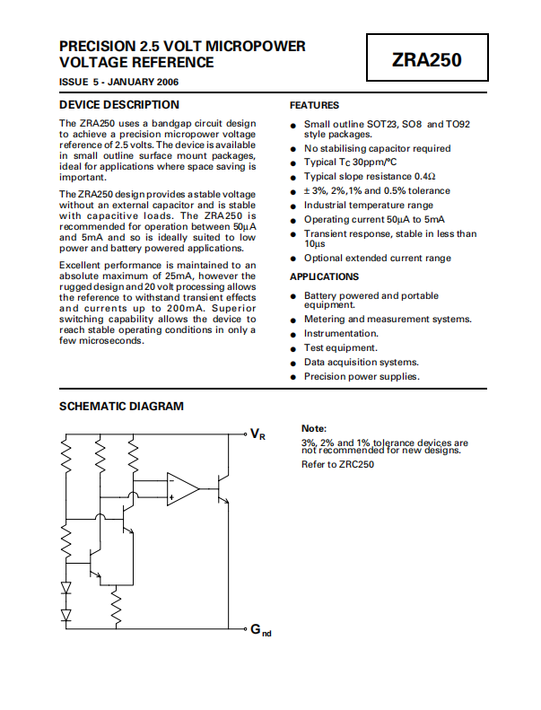 The ZRA250 uses a bandgap circuit design to achieve a precision micropower voltage reference of 2.5 volts. The device is available in small outline surface mount packages, ideal for applications where space saving is important.