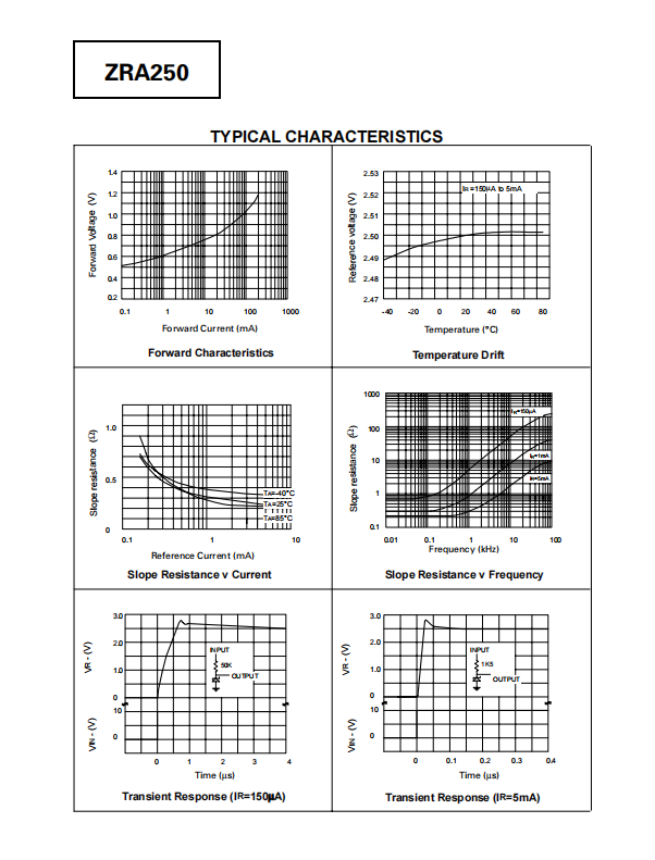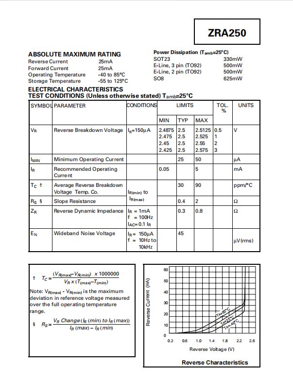 The ZRA250 design provides a stable voltage without an external capacitor and is stable with capacitive loads. The ZRA250 is recommended for operation between 50μA and 5mA and so is ideally suited to low power and battery powered applications.