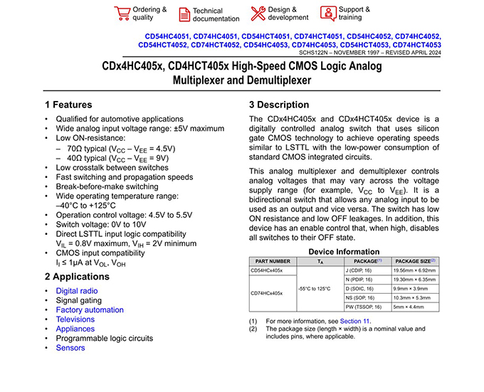 CD74HC4051E Analog Switches & Multiplexers ICs applications.
