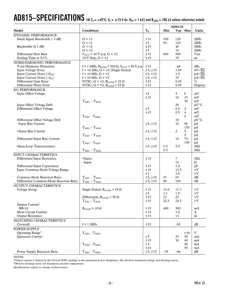 The AD815 consists of two high speed amplifiers capable of supplying a minimum of 500 mA. They are typically configured as a differential driver enabling an output signal of 40 V p-p on ±15 V supplies. This can be increased further with the use of a coupling transformer with a greater than 1:1 turns ratio. The low harmonic distortion of –66 dB @ 1 MHz into 200 ? combined with the wide bandwidth and high current drive make the differential driver ideal for communication applications such as subscriber line interfaces for ADSL, HDSL and VDSL.
