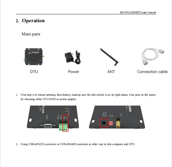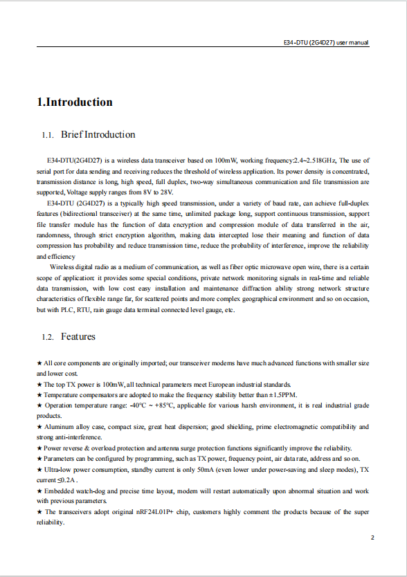 E34-DTU(2G4D27) is a wireless data transceiver based on 100mW, working frequency:2.4~2.518GHz, The use of serial port for data sending and receiving reduces the threshold of wireless application. Its power density is concentrated, transmission