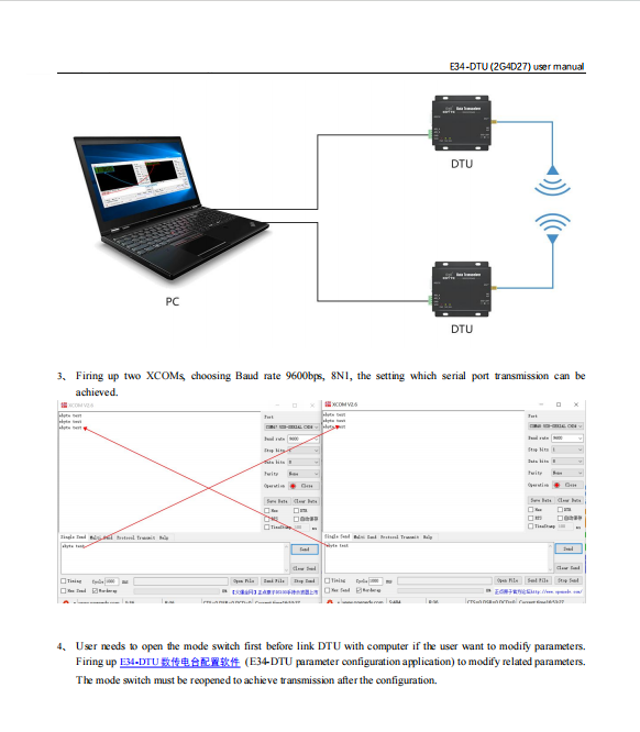 E34-DTU (2G4D27) is a typically high speed transmission, under a variety of baud rate, can achieve full-duplex features (bidirectional transceiver) at the same time, unlimited package long, support continuous transmission, support file transfer module
