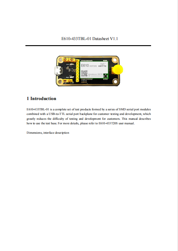 E610-433TBL-01 is a complete set of test products formed by a series of SMD serial port modules combined with a USB-to-TTL serial port backplane for customer testing and development, which greatly reduces the difficulty of testing and