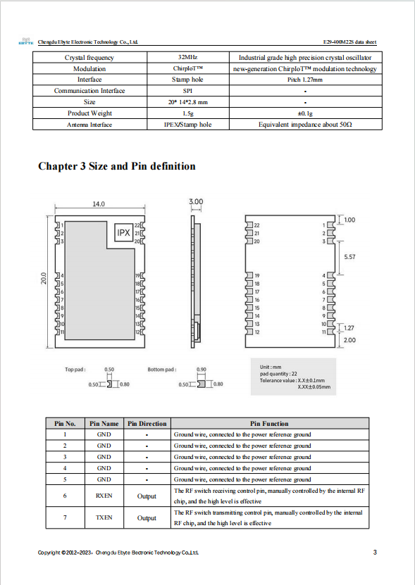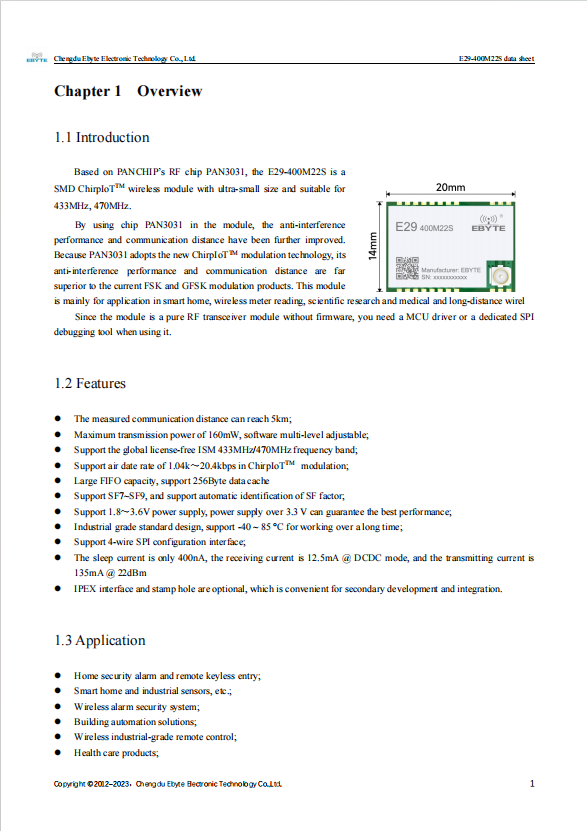 Based on PANCHIP’s RF chip PAN3031, the E29-400M22S is a SMD ChirpIoTTM wireless module with ultra-small size and suitable for433MHz, 470MHz.