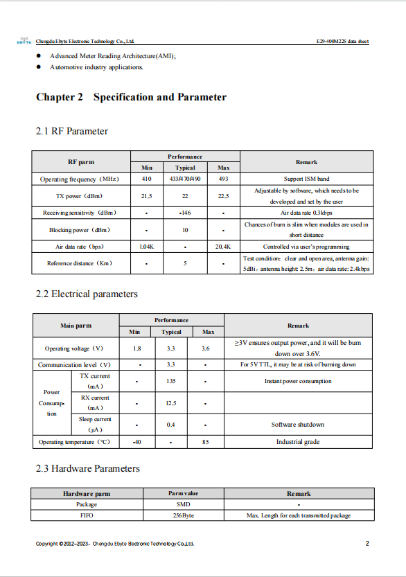 | Operating frequency(MHz) | 410~493 | Support ISM band |