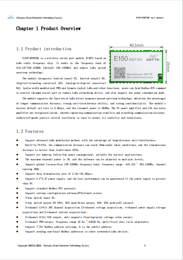 E150-400T30S is a wireless serial port module (UART) based on LoRa radio frequency chip. It works in the frequency band of 410.125~493.125MHz (default 433.125MHz) and adopts LoRa spread spectrum technology.