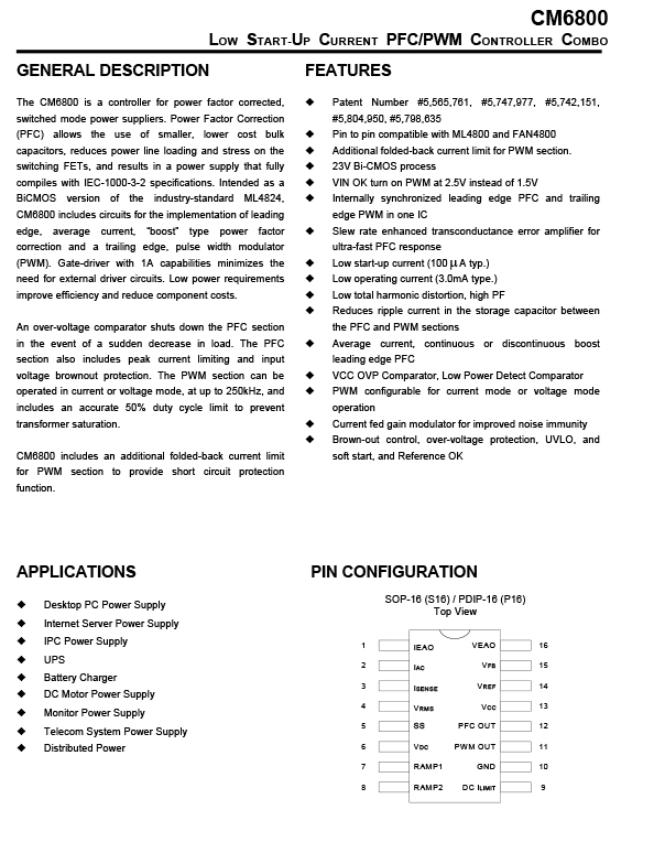 The CM6800 is a controller for power factor corrected, switched mode power suppliers. Power Factor Correction (PFC) allows the use of smaller, lower cost bulk capacitors, reduces power line loading and stress on the switching FETs, and results in a power supply that fully compiles with IEC-1000-3-2 specifications. Intended as a BiCMOS version of the industry-standard ML4824,