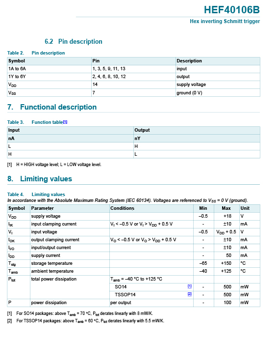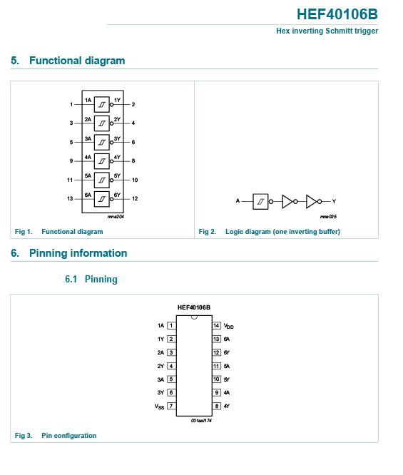 General description The HEF40106B provides six inverting buffers. Each input has a Schmitt trigger circuit. The inverting buffer switches at different points for positive-going and negative-going signals. The difference between the positive voltage (VT+) and the negative voltage (VT-) is defined as hysteresis voltage (VH). The HEF40106B may be used for enhanced noise immunity or to “square up” slowly changing waveforms. It operates over a recommended VDD power supply range of 3 V to 15 V referenced to VSS (usually ground). Unused inputs must be connected to VDD, VSS, or another input. It is also suitable for use over both the industrial (-40℃ to +85℃) and automotive ( -40℃ to +125 ℃) temperature ranges. Features and benefits ■ Schmitt trigger input discrimination ■ Fully static operation ■ 5 V, 10 V, and 15 V parametric ratings ■ Standardized symmetrical output characteristics ■ Operates across the automotive temperature range from -40 °C to +125 °C ■ Complies with JEDEC standard JESD 13-B Applications ■ Wave and pulse shapers ■ Astable multivibrators ■ Monostable multivibrators |