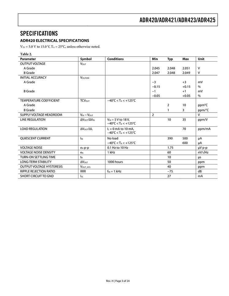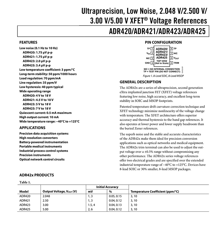 GENERAL DESCRIPTION The ADR42x are a series of ultraprecision, second generation eXtra implanted junction FET (XFET) voltage references featuring low noise, high accuracy, and excellent long-term stability in SOIC and MSOP footprints. FEATURES Low noise (0.1 Hz to 10 Hz) ADR420: 1.75 μV p-p ADR421: 1.75 μV p-p ADR423: 2.0 μV p-p ADR425: 3.4 μV p-p Low temperature coefficient: 3 ppm/°C Long-term stability: 50 ppm/1000 hours Load regulation: 70 ppm/mA Line regulation: 35 ppm/V Low hysteresis: 40 ppm typical Wide operating range ADR420: 4 V to 18 V ADR421: 4.5 V to 18 V ADR423: 5 V to 18 V ADR425: 7 V to 18 V Quiescent current: 0.5 mA maximum High output current: 10 mA Wide temperature range: ?40°C to +125°C APPLICATIONS Precision data acquisition systems High resolution converters Battery-powered instrumentation Portable medical instruments Industrial process control systems Precision instruments Optical network control circuits |