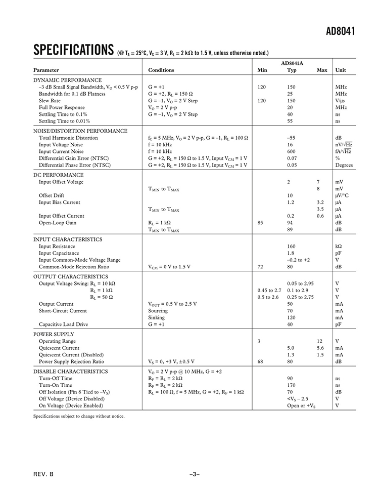 PRODUCT DESCRIPTION The AD8041 is a low power voltage feedback, high speed amplifier designed to operate on +3 V, +5 V, or ±5 V supplies. It has true single-supply capability with an input voltage range extending 200 mV below the negative rail and within 1 V of the positive rail. The output voltage swing extends to within 50 mV of each rail, providing the maximum output dynamic range. Additionally, it features gain flatness of 0.1 dB to 30 MHz while offering differential gain and phase error of 0.03% and 0.03° on a single 5 V supply. This makes the AD8041 ideal for professional video electronics such as cameras, video switchers, or any high speed portable equipment. The AD8041’s low distortion and fast settling make it ideal for buffering high speed A-to-D converters. FEATURES Fully Specified for +3 V, +5 V, and ±5 V Supplies Output Swings Rail to Rail Input Voltage Range Extends 200 mV Below Ground No Phase Reversal with Inputs 1 V Beyond Supplies Disable/Power-Down Capability Low Power of 5.2 mA (26 mW on 5 V) High Speed and Fast Settling on 5 V: 160 MHz –3 dB Bandwidth (G = +1) 160 V/μs Slew Rate 30 ns Settling Time to 0.1% Good Video Specifications (RL = 150 Ω, G = +2) Gain Flatness of 0.1 dB to 30 MHz 0.03% Differential Gain Error 0.03° Differential Phase Error Low Distortion –69 dBc Worst Harmonic @ 10 MHz Outstanding Load Drive Capability Drives 50 mA 0.5 V from Supply Rails Cap Load Drive of 45 pF APPLICATIONS Power Sensitive High Speed Systems Video Switchers Distribution Amplifiers A/D Drivers Professional Cameras CCD Imaging Systems Ultrasound Equipment (Multichannel) Single-Supply Multiplexer |