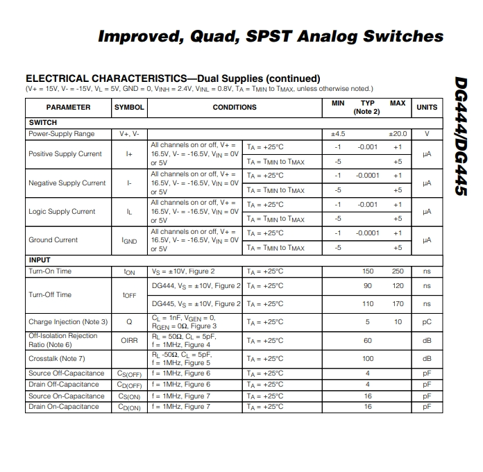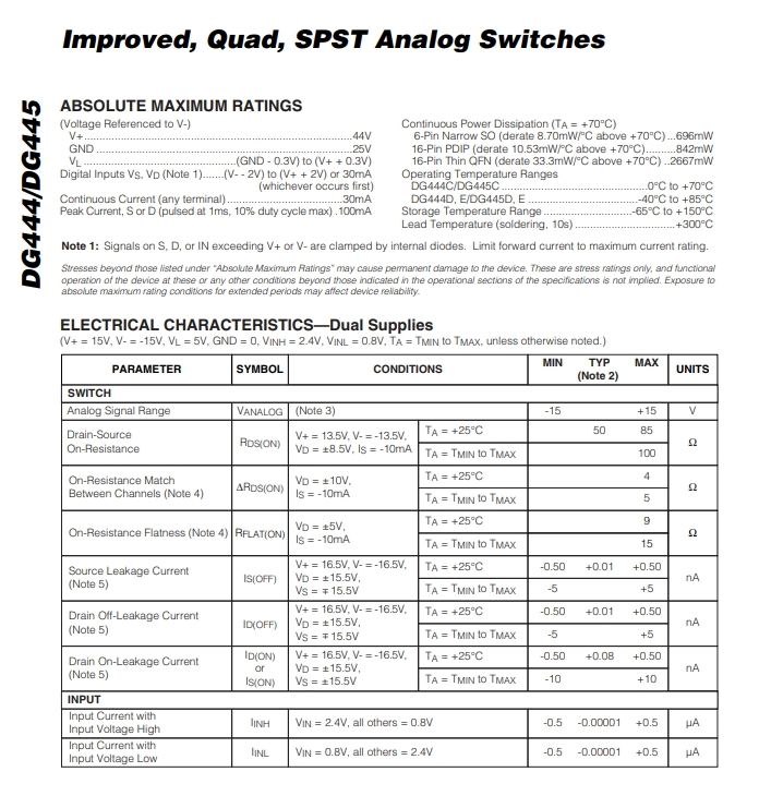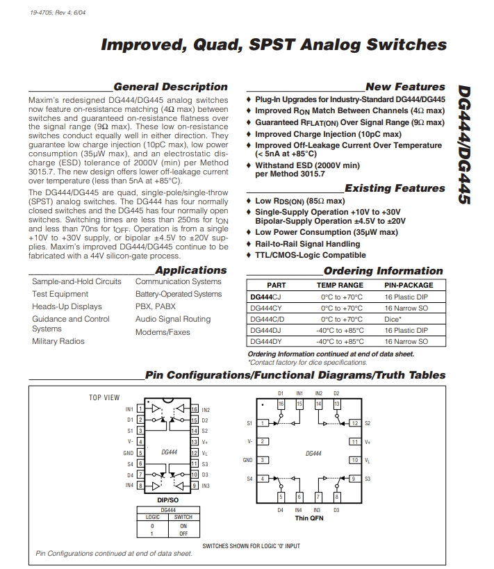 analog switches and TTL and CMOS compatible digital inputs. These switches feature lower analog ON resistance (<85Ω) and faster switch time (tON <250ns) compared to the DG211 and DG212. Charge injection has been reduced, simplifying sample and hold applications. Features ? ON Resistance (Max). . . . . . . . . . . . . . . . . . . . . . . . . 85Ω ? Low Power Consumption (PD) . . . . . . . . . . . . . . . <35μW ? Fast Switching Action - tON (Max) . . . . . . . . . . . . . . . . . . . . . . . . . . . . . . . 250ns - tOFF (Max, DG444) . . . . . . . . . . . . . . . . . . . . . . . 140ns ? Low Charge Injection ? Upgrade from DG211, DG212 ? TTL, CMOS Compatible ? Single or Split Supply Operation ? Pb-Free Plus Anneal Available (RoHS Compliant) Applications ? Audio Switching ? Battery Operated Systems ? Data Acquisition ? Hi-Rel Systems ? Sample and Hold Circuits ? Communication Systems ? Automatic Test Equipment |