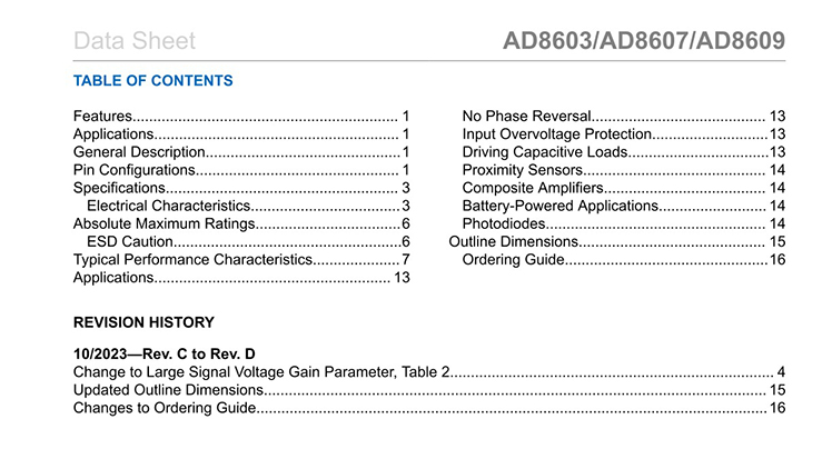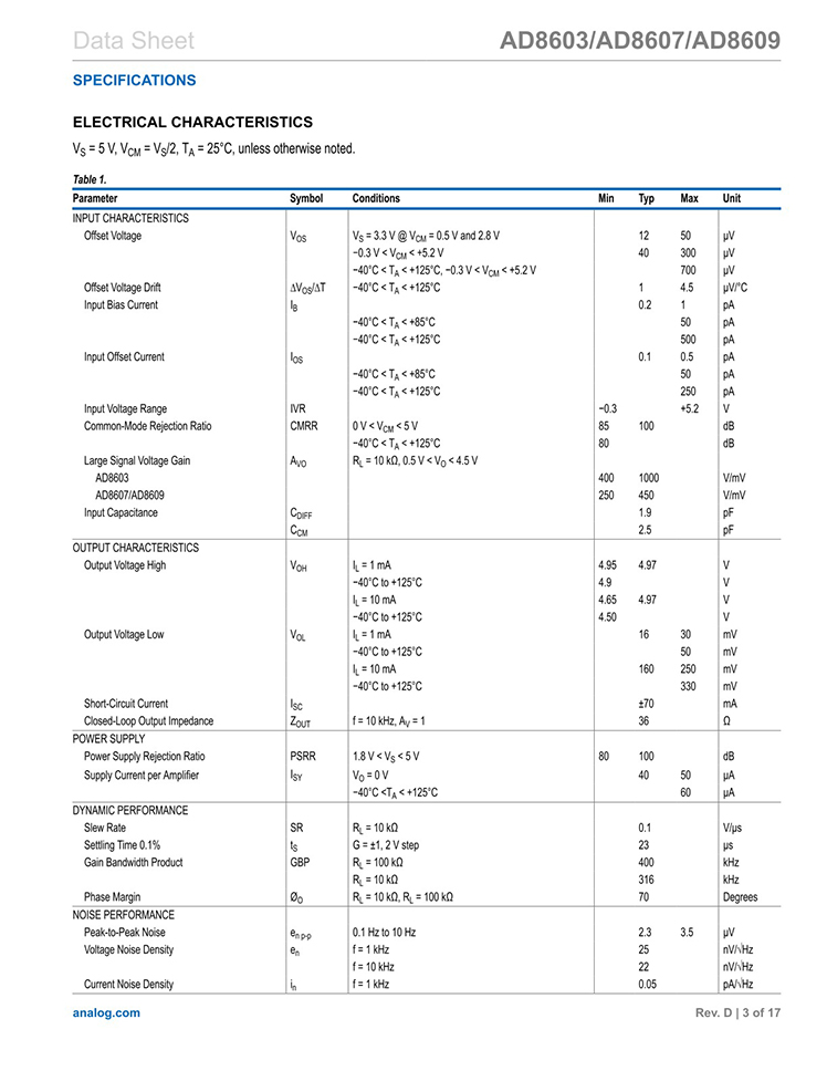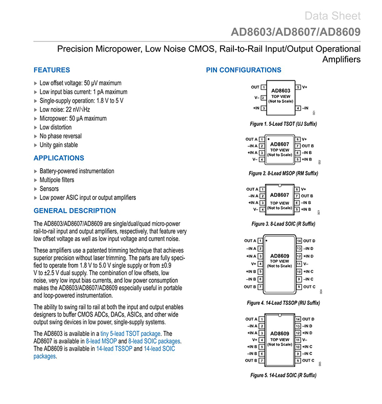 The AD8603/AD8607/AD8609 are single/dual/quad micropower rail-to-rail input and output amplifiers, respectively, that feature very low offset voltage as well as low input voltage and current noise.