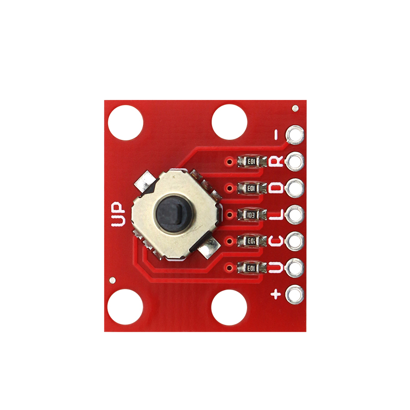 Sometimes you need a very small directional input device (world’s smallest game controller, anyone?) This 5-way tactile switch (up, down, left, right, and center click) allows for joystick-like control in a very small package. This breadboard-friendly board breaks out all the switch signals, and includes pullup resistors configured so that the outputs read low when pressed, and high otherwise. (If you wish, you can reverse the power leads for pull-down operation.)