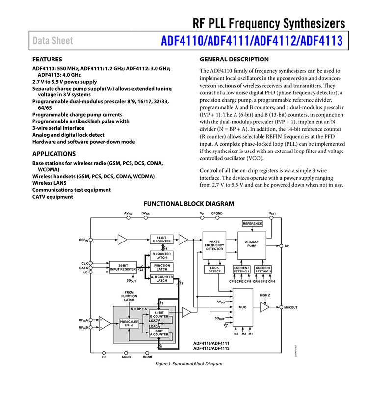 GENERAL DESCRIPTION The ADF4110 family of frequency synthesizers can be used to implement local oscillators in the upconversion and downconversion sections of wireless receivers and transmitters. They consist of a low noise digital PFD (phase frequency detector), a precision charge pump, a programmable reference divider, programmable A and B counters, and a dual-modulus prescaler (P/P + 1). The A (6-bit) and B (13-bit) counters, in conjunction with the dual-modulus prescaler (P/P + 1), implement an N divider (N = BP + A). In addition, the 14-bit reference counter (R counter) allows selectable REFIN frequencies at the PFD input. A complete phase-locked loop (PLL) can be implemented if the synthesizer is used with an external loop filter and voltage controlled oscillator (VCO). FEATURES ADF4110: 550 MHz; ADF4111: 1.2 GHz; ADF4112: 3.0 GHz; ADF4113: 4.0 GHz 2.7 V to 5.5 V power supply Separate charge pump supply (VP) allows extended tuning voltage in 3 V systems Programmable dual-modulus prescaler 8/9, 16/17, 32/33, 64/65 Programmable charge pump currents Programmable antibacklash pulse width 3-wire serial interface Analog and digital lock detect Hardware and software power-down mode APPLICATIONS Base stations for wireless radio (GSM, PCS, DCS, CDMA, WCDMA) Wireless handsets (GSM, PCS, DCS, CDMA, WCDMA) Wireless LANS Communications test equipment CATV equipment |