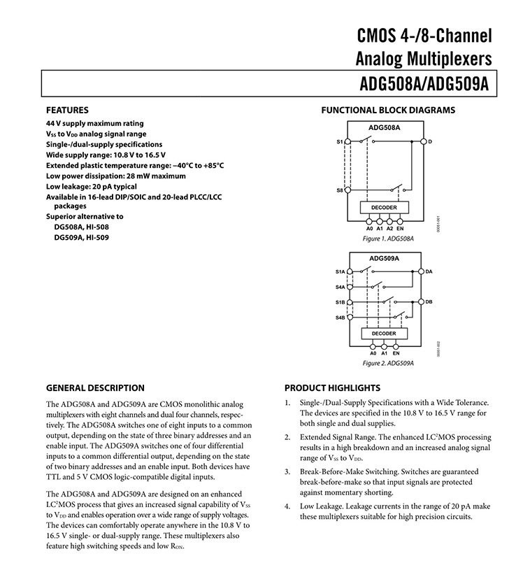 GENERAL DESCRIPTION The ADG508A and ADG509A are CMOS monolithic analog multiplexers with eight channels and dual four channels, respectively. The ADG508A switches one of eight inputs to a common output, depending on the state of three binary addresses and an enable input. The ADG509A switches one of four differential inputs to a common differential output, depending on the state of two binary addresses and an enable input. Both devices have TTL and 5 V CMOS logic-compatible digital inputs. FEATURES 44 V supply maximum rating VSSto VDDanalog signal range Single-/dual-supply specifications Wide supply range: 10.8 V to 16.5 V Extended plastic temperature range: ?40°C to +85°C Low power dissipation: 28 mW maximum Low leakage: 20 pA typical Available in 16-lead DIP/SOIC and 20-lead PLCC/LCC packages Superior alternative to DG508A, HI-508 DG509A, HI-509 |
