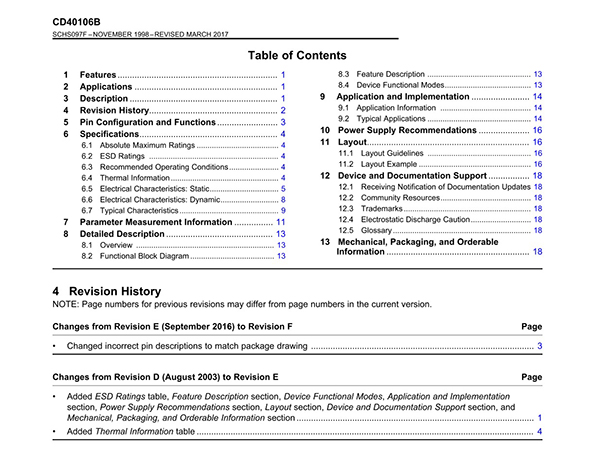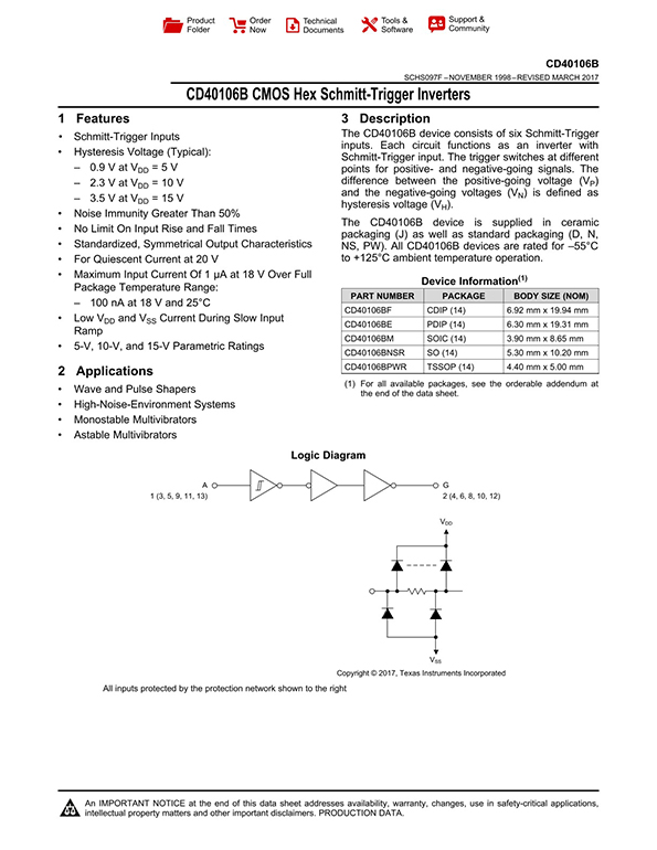 General Description The CD40106BC Hex Schmitt Trigger is a monolithic complementary MOS (CMOS) integrated circuit constructed with N and P-channel enhancement transistors. Features ■Wide supply voltage range: 3V to 15V ■High noise immunity: 0.7 VDD(typ.) ■Low power TTL compatibility: Fan out of 2 driving 74L or 1 driving 74LS ■Hysteresis: 0.4 VDD(typ.), 0.2 VDD guaranteed ■Equivalent to MM74C14 ■Equivalent to MC14584B |