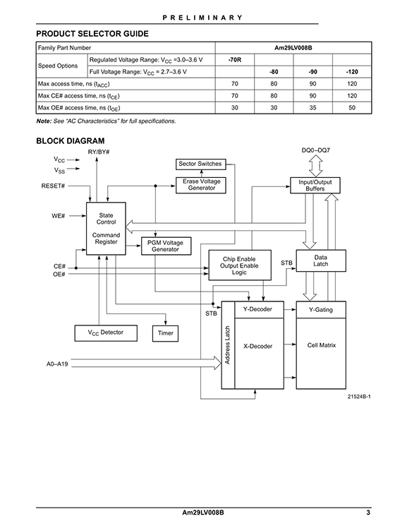 GENERAL DESCRIPTION The Am29LV008B is an 8 Mbit, 3.0 volt-only Flash memory organized as 1,048,576 bytes. The device is offered in a 40-pin TSOP package. The byte-wide (x8) data appears on DQ7–DQ0. This device requires only a single, 3.0 volt VCC supply to perform read, program, and erase operations. A standard EPROM programmer can also be used to program and erase the device. DISTINCTIVE CHARACTERISTICS ■ Single power supply operation — Full voltage range: 2.7 to 3.6 volt read and write operations for battery-powered applications — Regulated voltage range: 3.0 to 3.6 volt read and write operations and for compatibility with high performance 3.3 volt microprocessors ■ Manufactured on 0.32 μm process technology — Compatible with 0.5 μm Am29LV008 device ■ High performance — Full voltage range: access times as fast as 90 ns — Regulated voltage range: access times as fast as 70 ns ■ Ultra low power consumption (typical values at 5 MHz) — 200 nA Automatic Sleep mode current — 200 nA standby mode current — 7 mA read current — 15 mA program/erase current ■ Flexible sector architecture — One 16 Kbyte, two 8 Kbyte, one 32 Kbyte, and fifteen 64 Kbyte sectors — Supports full chip erase — Sector Protection features: A hardware method of locking a sector to prevent any program or erase operations within that sector Sectors can be locked in-system or via programming equipment Temporary Sector Unprotect feature allows code changes in previously locked sectors ■ Unlock Bypass Program Command — Reduces overall programming time when issuing multiple program command sequences ■ Top or bottom boot block configurations available ■ Embedded Algorithms — Embedded Erase algorithm automatically preprograms and erases the entire chip or any combination of designated sectors — Embedded Program algorithm automatically writes and verifies data at specified addresses ■ Minimum 1,000,000 write cycle guarantee per sector ■ 20-year data retention at 125°C — Reliable operation for the life of the system ■ Package option — 40-pin TSOP ■ Compatibility with JEDEC standards — Pinout and software compatible with singlepower supply Flash — Superior inadvertent write protection ■ Data# Polling and toggle bits — Provides a software method of detecting program or erase operation completion ■ Ready/Busy# pin (RY/BY#) — Provides a hardware method of detecting program or erase cycle completion ■ Erase Suspend/Erase Resume — Suspends an erase operation to read data from, or program data to, a sector that is not being erased, then resumes the erase operation ■ Hardware reset pin (RESET#) — Hardware method to reset the device to reading array data |