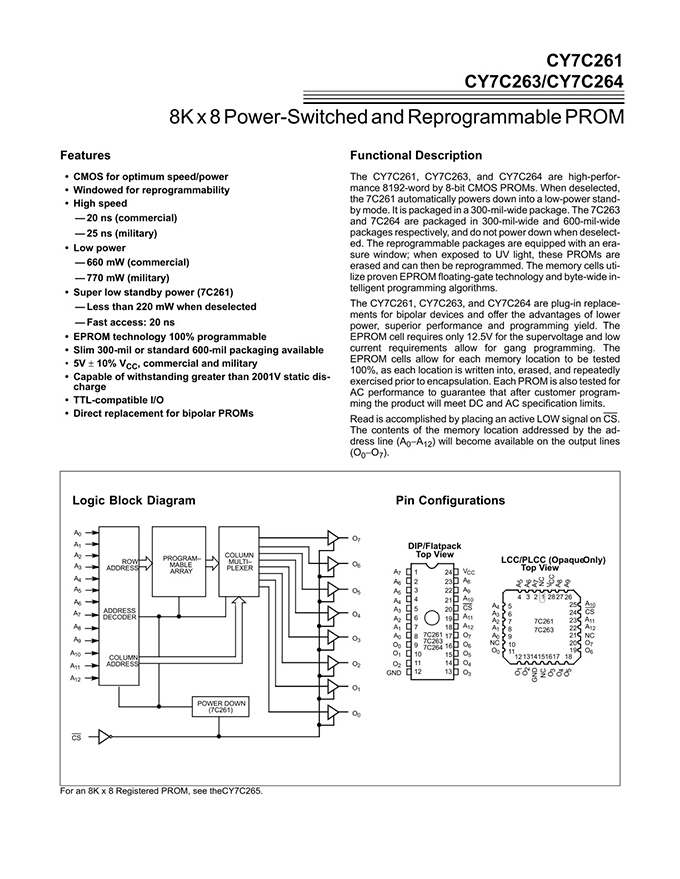 Functional Description The CY7C261, CY7C263, and CY7C264 are high-performance 8192-word by 8-bit CMOS PROMs. When deselected, the CY7C261 automatically powers down into a low-power standby mode. It is packaged in a 300-mil-wide package. The CY7C263 and CY7C264 are packaged in 300-mil-wide and 600-mil-wide packages respectively, and do not power down when deselected. The reprogrammable packages are equipped with an erasure window; when exposed to UV light, these PROMs are erased and can then be reprogrammed. The memory cells utilize proven EPROM floating-gate technology and byte-wide intelligent programming algorithms. Features ? CMOS for optimum speed/power ? Windowed for reprogrammability ? High speed — 20 ns (Commercial) — 25 ns (Military) ? Low power — 660 mW (Commercial) — 770 mW (Military) ? Super low standby power (7C261) — Less than 220 mW when deselected — Fast access: 20 ns ? EPROM technology 100% programmable ? Slim 300-mil or standard 600-mil packaging available ? 5V ± 10% VCC, commercial and military ? Capable of withstanding greater than 2001V static discharge ? TTL-compatible I/O ? Direct replacement for bipolar PROMs |
