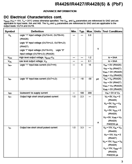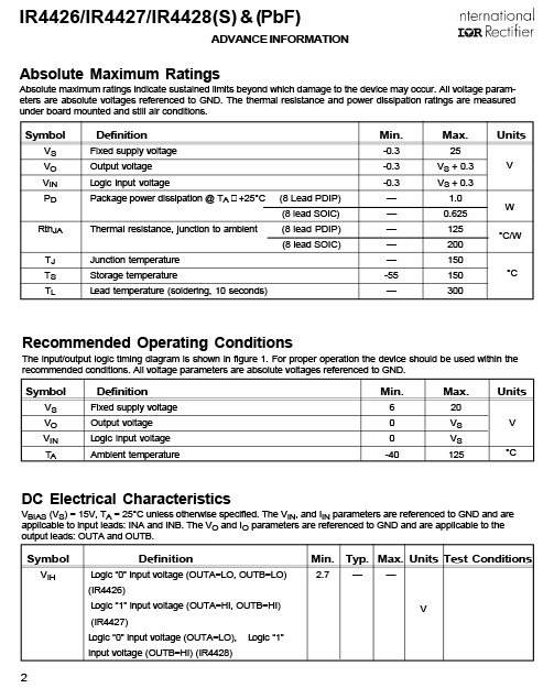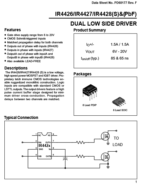 IO+/- 1.5A / 1.5A VOUT 6V - 20V ton/off(typ.) 85 & 65 ns Descriptions The IR4426/IR4427/IR4428 (S) is a low voltage, high speed power MOSFET and IGBT driver. Proprietary latch immune CMOS technologies enable ruggedized monolithic construction. Logic inputs are compatible with standard CMOS or LSTTL outputs. The output drivers feature a high pulse current buffer stage designed for minimum driver cross-conduction. Propagation delays between two channels are matched. Features ?Gate drive supply range from 6 to 20V ?CMOS Schmitt-triggered inputs ?Matched propagation delay for both channels ?Outputs out of phase with inputs (IR4426) ?Outputs in phase with inputs (IR4427) ?OutputA out of phase with inputA and OutputB in phase with inputB (IR4428) ?Also available LEAD-FREE |